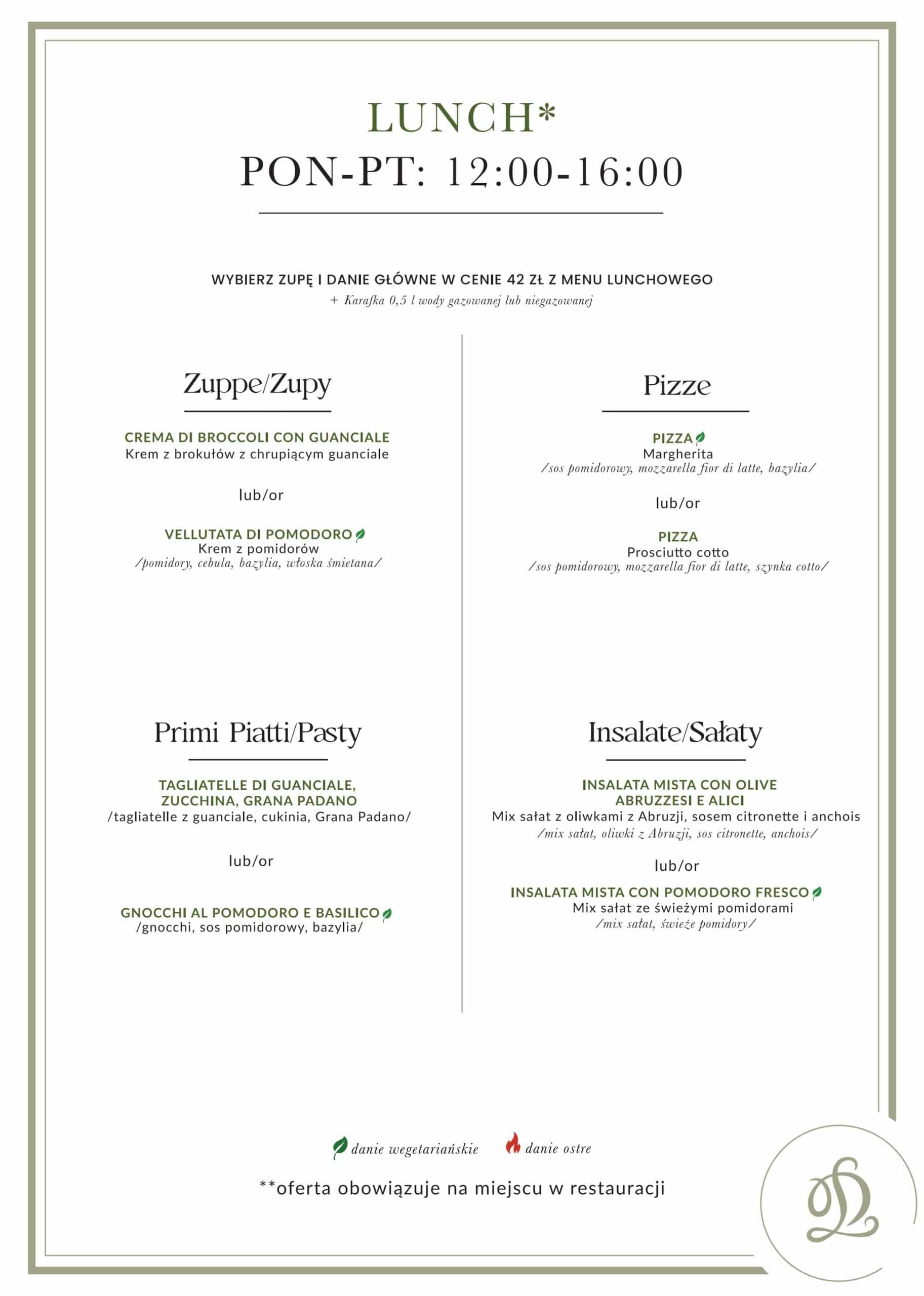 W środku dnia najlepiej smakuje to, co proste i prawdziwe. Dlatego od poniedziałku do piątku, w godz. 12:00–16:00, serwujemy Włoski Lunch w da Luciano.